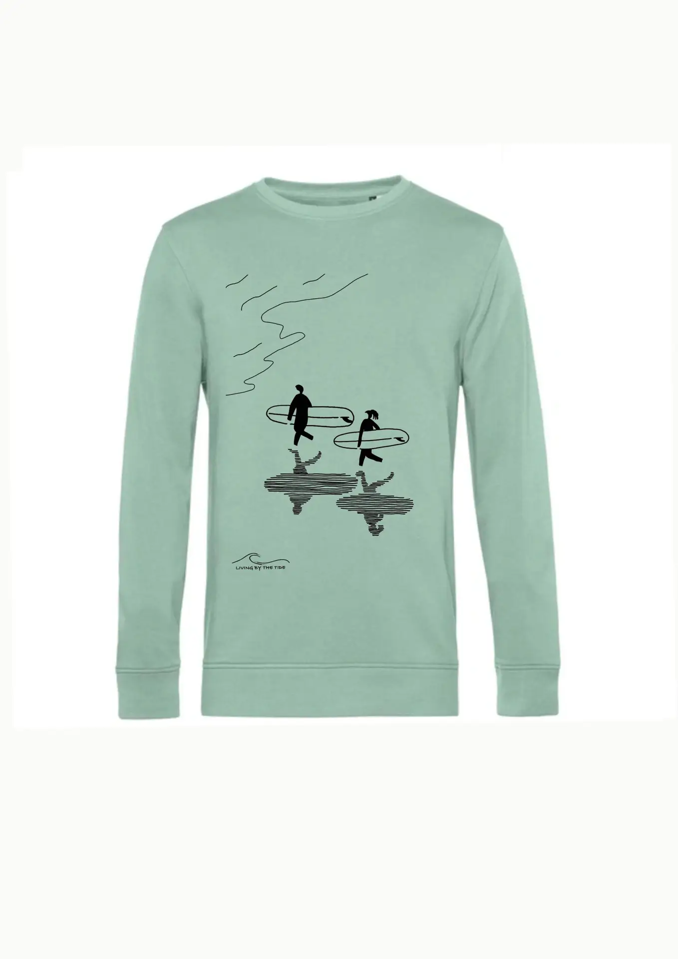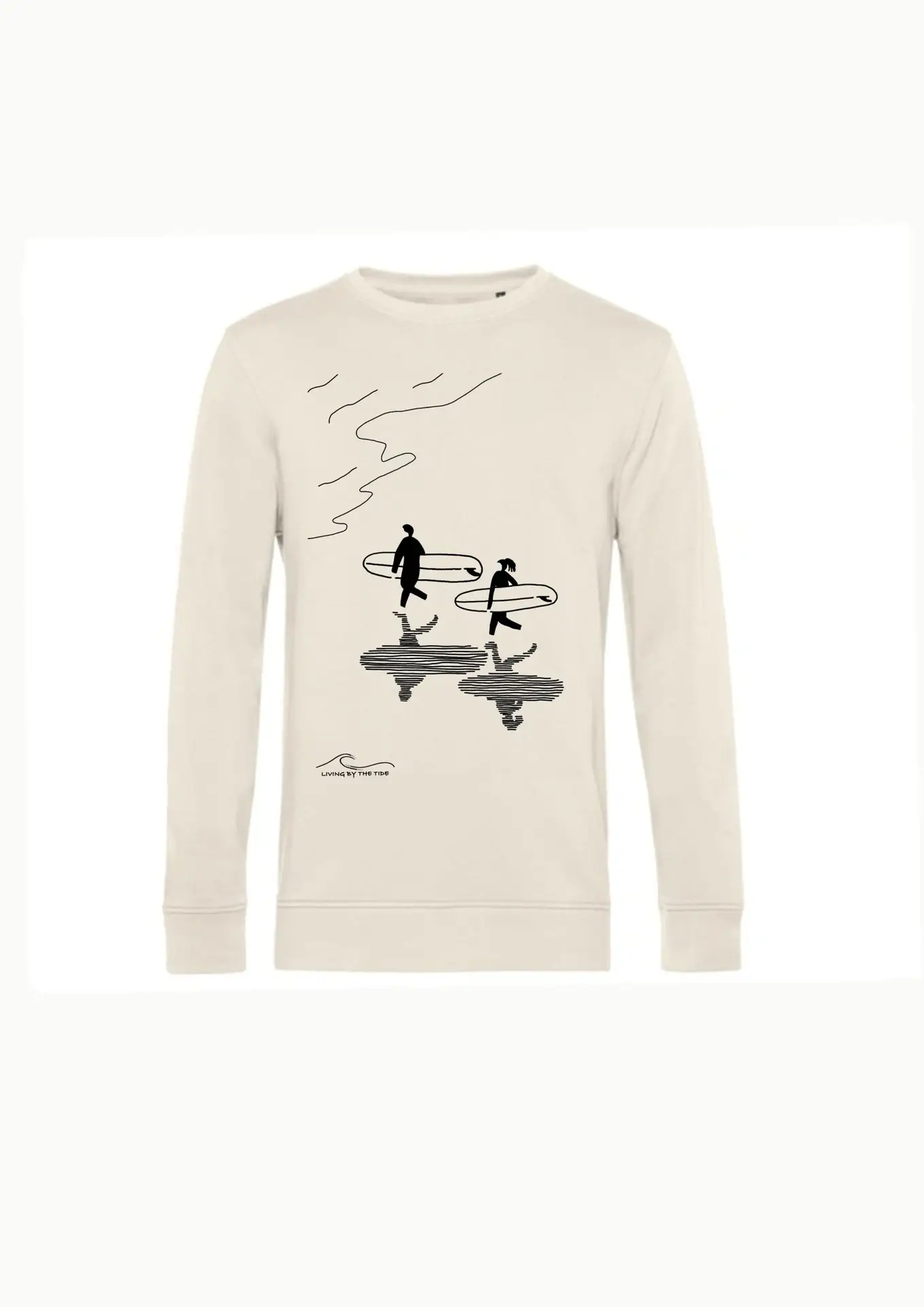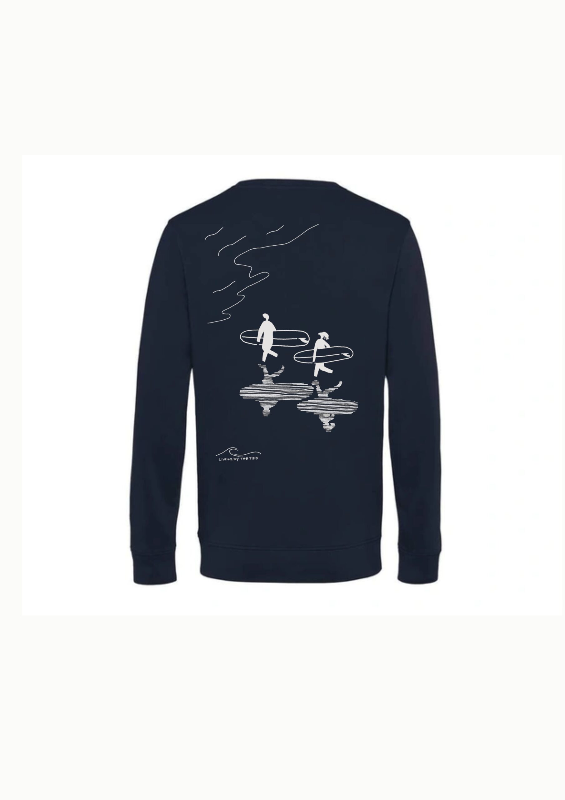 The Surfers and Shadows Sweater reflects a natural scene on the beach: surfers walking toward the sea for their moment of joy. The sun plays with the creation of shadows, stretching across the sand, moving like a quiet dance with the waves.